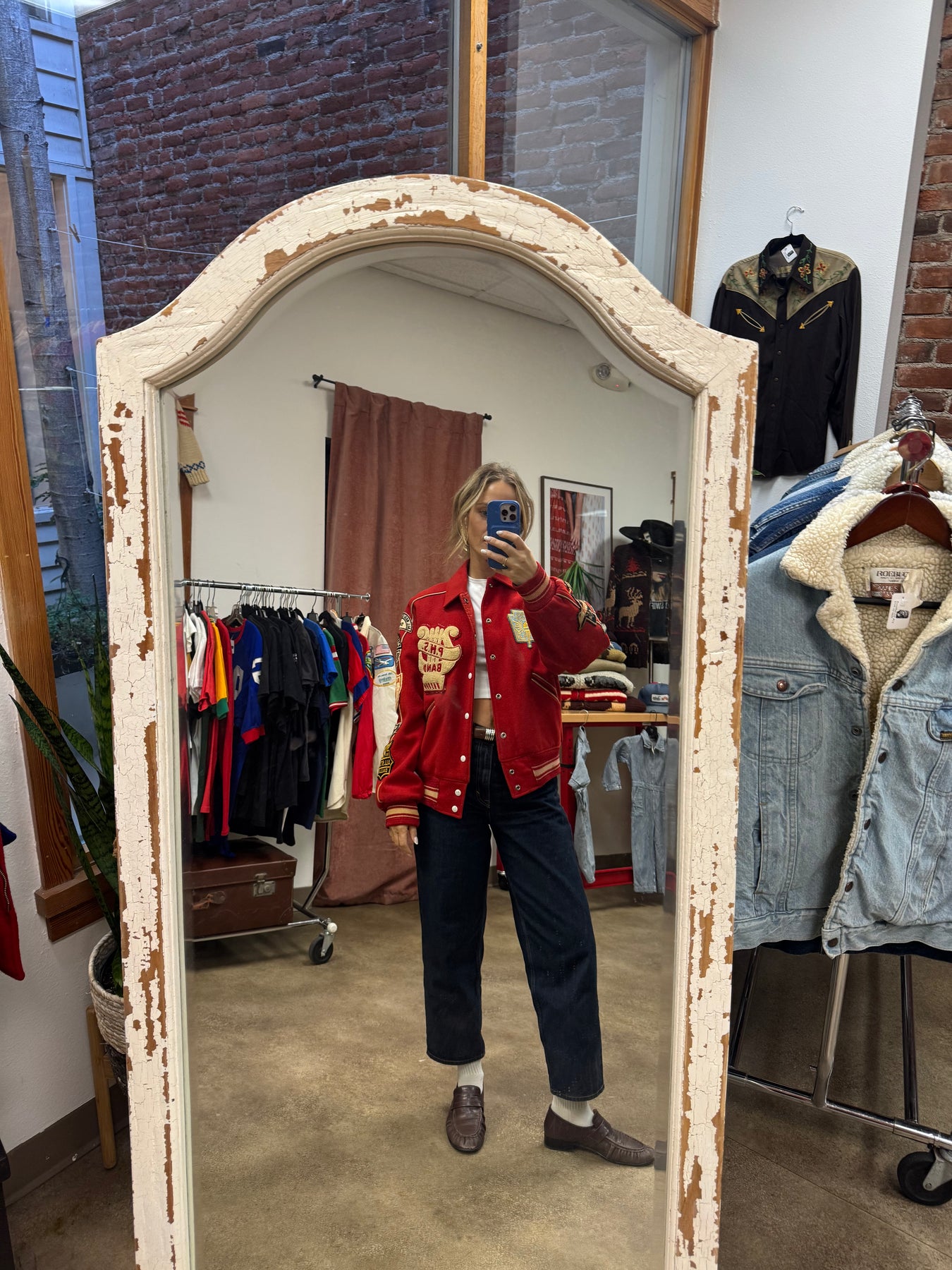 Step back into classic school spirit with this authentic vintage P.H.S. Band letterman jacket. Crafted from rich, heavyweight red wool with detailed chenille patches, this jacket tells a story of musical pride and standout achievement.