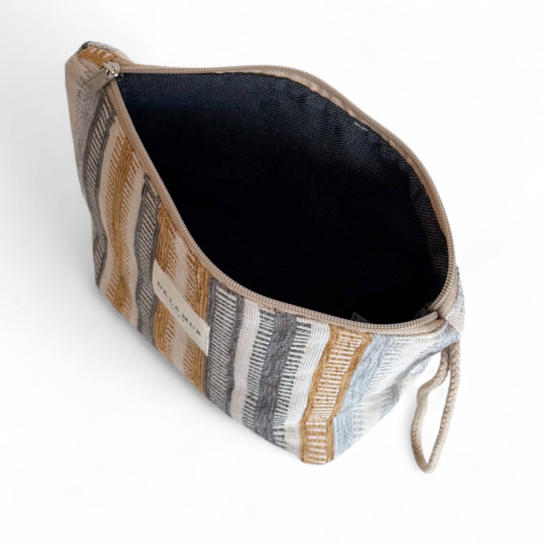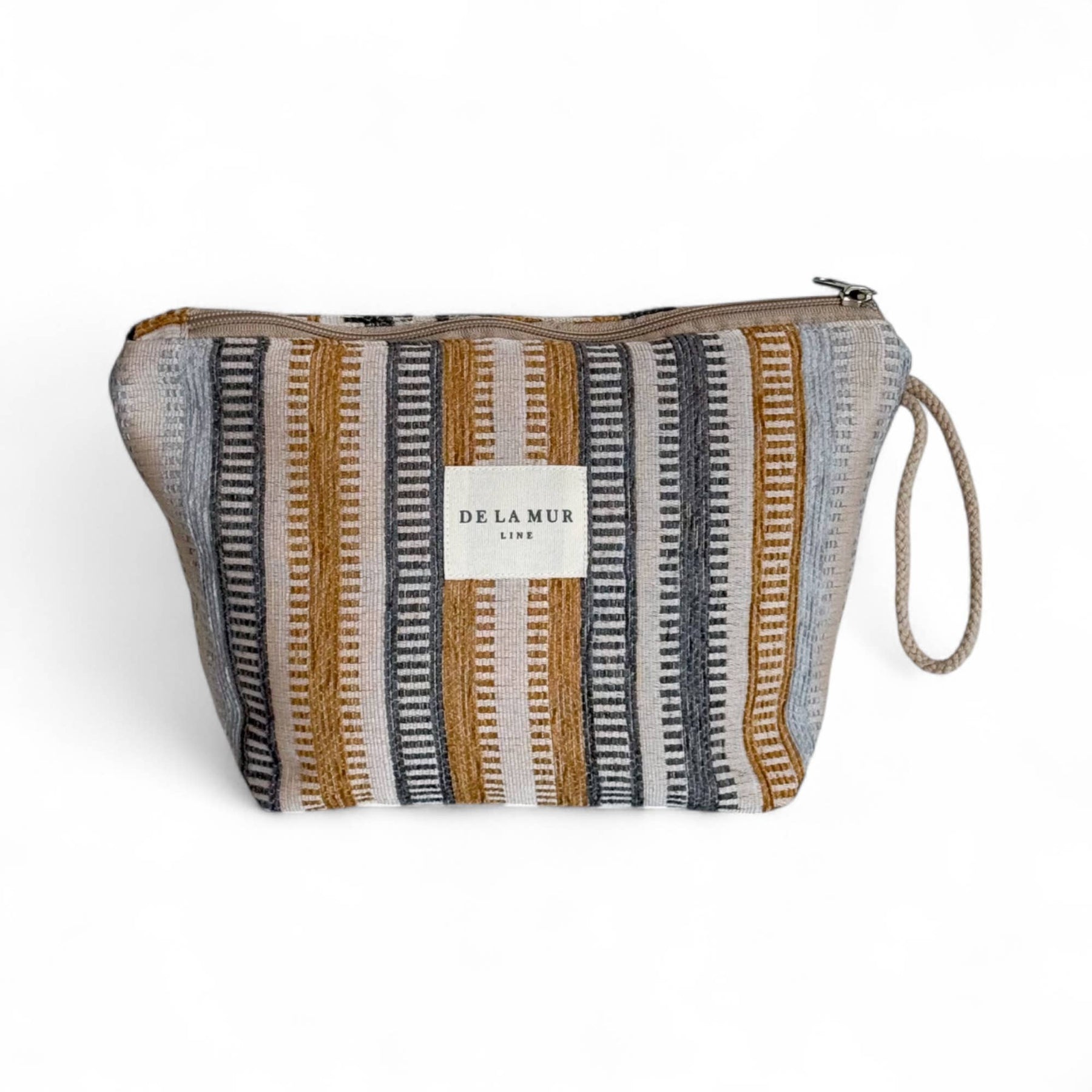 Large pouch with a zipper on top and a beige cord handle on the side. Made from thick jacquard fabric with a multicolor striped pattern. For proper care, wash in cold water and do not tumble dry. Ideal for travel, the beach, or daily use. You can carry everything you need with you. Height x Width: 11.8 x 7.5 in Made in Spain using national fabrics.