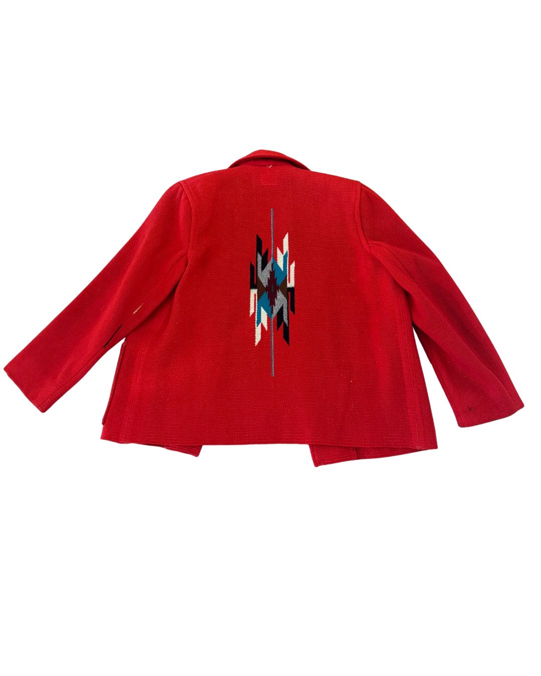 A bold vintage Chimayo wool jacket, handwoven and hand tailored in New Mexico using traditional Southwestern weaving techniques. Crafted from 100% wool, this piece features a rich red ground with striking geometric Chimayo motifs woven vertically on the front panels and echoed by a centered back medallion.