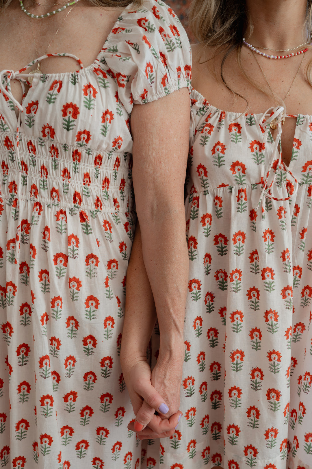 Handmade in India from 100% cotton and block printed with a cheerful floral motif, Eva is light, breathable, and grounded in timeless craft. Pair her with a sunhat and sandals for a vintage countryside feel, or dress her up with heeled clogs and a bold lip.