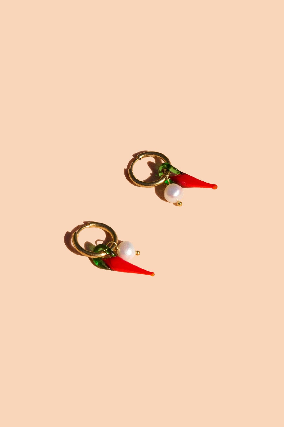 * 18k gold plated over stainless steel hoops * handmade murano glass peppers * fresh water pearls * waterproof * made with materials ethically sourced Pictured with the Caliente Necklace