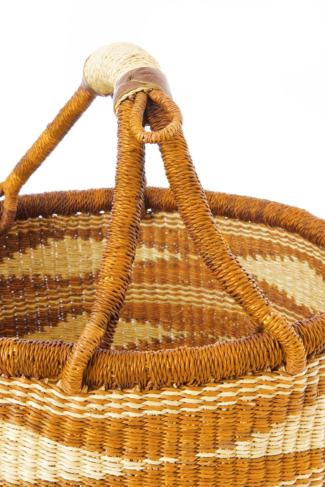 Bolga baskets are perhaps the most iconic of handmade African baskets, so it's no surprise that they are loved and well-used in homes everywhere. Talented weavers in Bolgatanga, Ghana, apply their skill to turn stiff stalks of elephant grass into these beautiful works of functional art. Please note, Bolga baskets are typically crafted with soft goatskin binding the handles. Without leather binding, handles are not as strong. Sold singly. Because this is a handcrafted item, each will vary slightly. NOTE: We ship Bolga baskets in two ways. We can fit more FLATTENED baskets into a box, saving you on shipping costs. Or, we can SHAPE your baskets before they ship. If you do not indicate during checkout that you wish for us to SHAPE your baskets, they will arrive flattened. You can shape your basket by wetting the straw and shaping the basket with your hands, then allowing it to dry. Dimensions: 15"L x 15"W x 15"H Crafted from: Elephant grass, dye, leather
