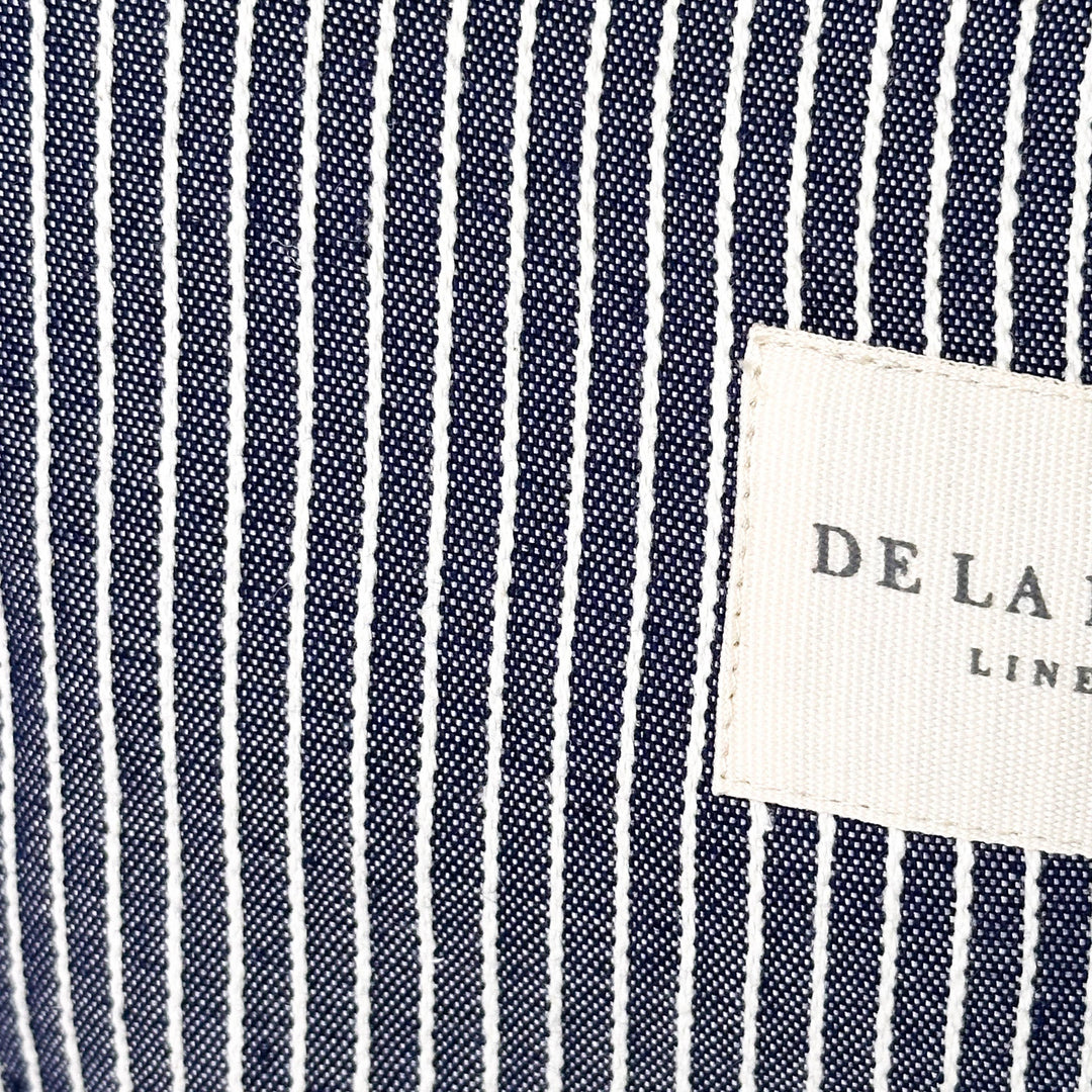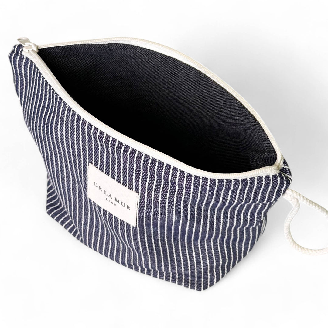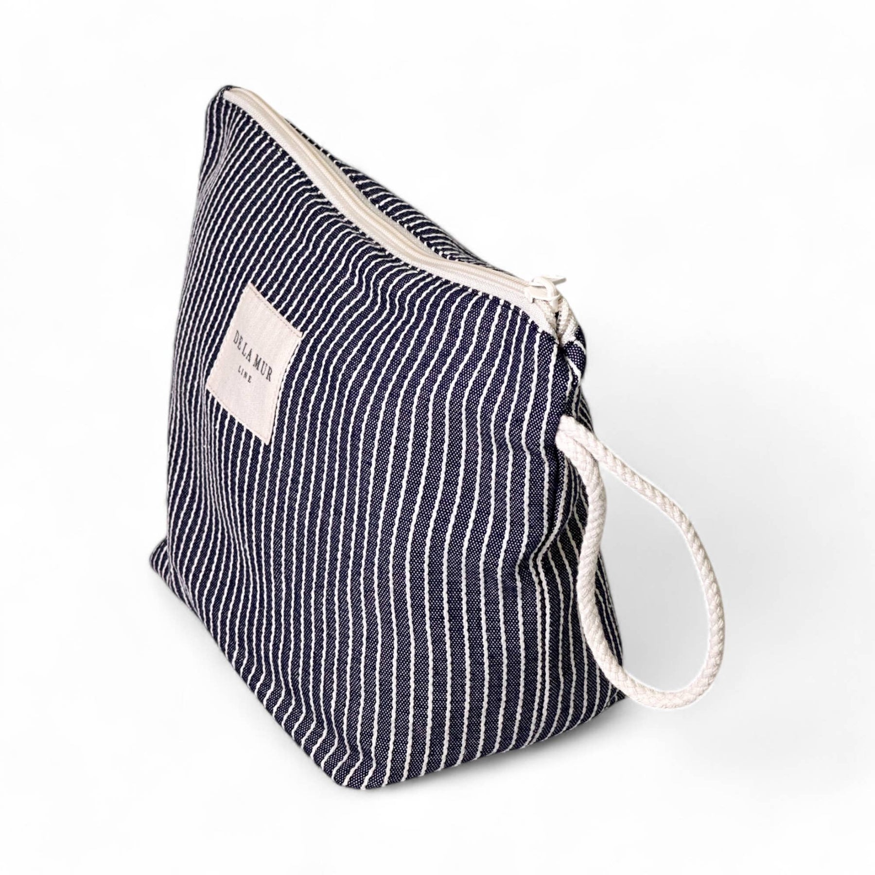 Toiletry bag with a zipper at the top and a cream-colored cord handle on the side. Made with thin striped fabric in off-white on a navy blue background. Lined with thick gray fabric on the inside. For proper care, it is recommended to wash it by hand in cold water and not to use a dryer.