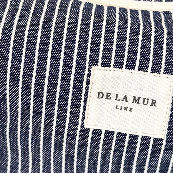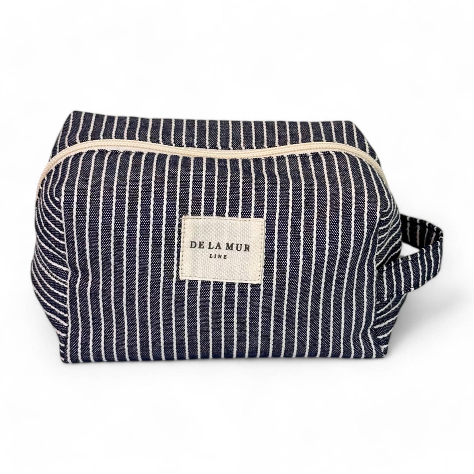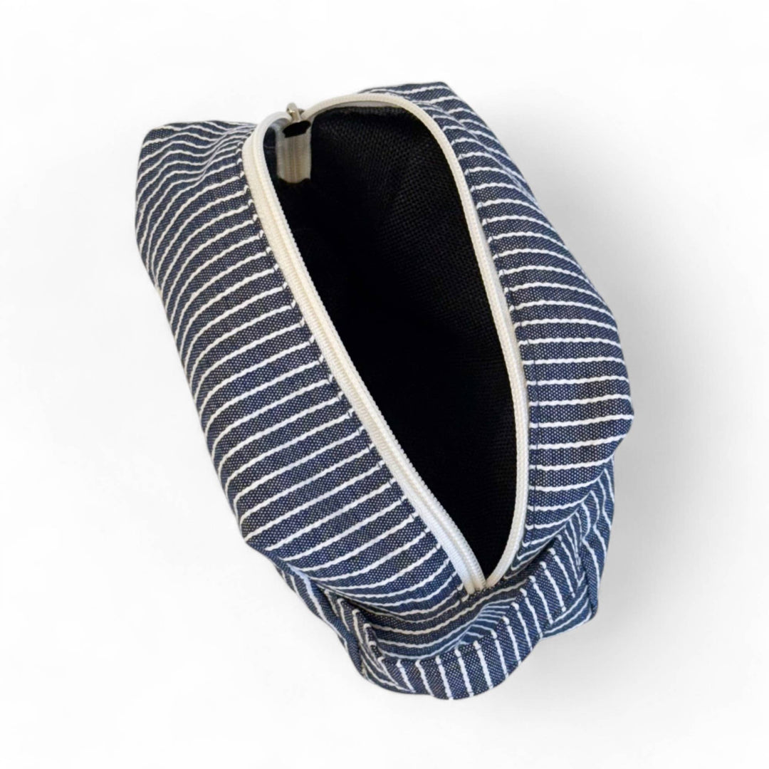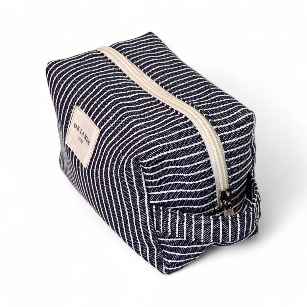 Medium toiletry bag with a zipper at the top and a side handle. Made with thin fabric with off-white stripes on a navy blue background. For proper care, it is recommended to wash it by hand in cold water and not to use a dryer. Ideal for storing makeup, facial creams, and small bottles. Height x Width 6.3 x 5.1 inches. Made with national fabrics from Spain. This spacious makeup bag doubles as a travel makeup bag, toiletries bag, or cosmetic bag—ideal for organizing beauty essentials, summer must-haves, and travel accessories in style.