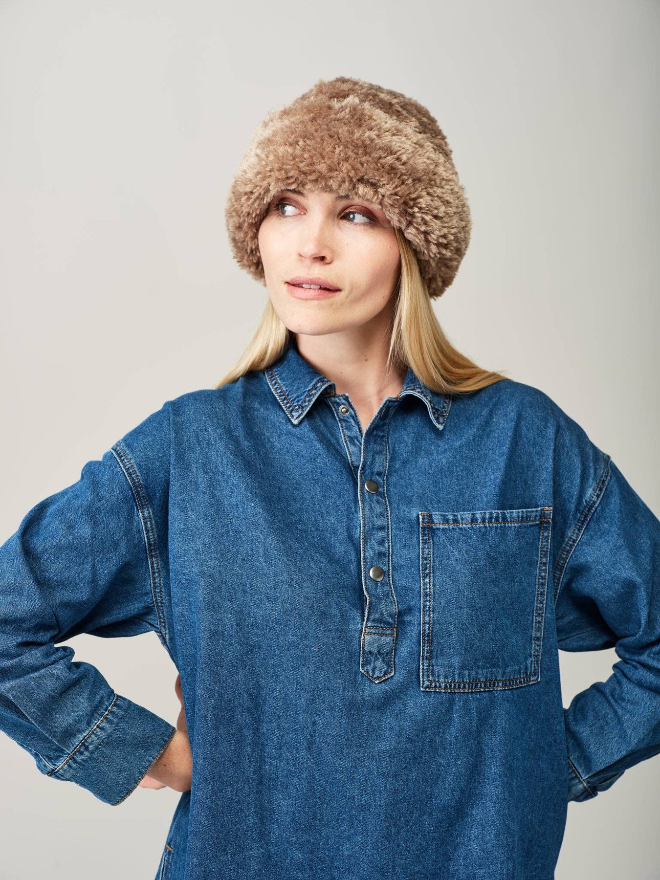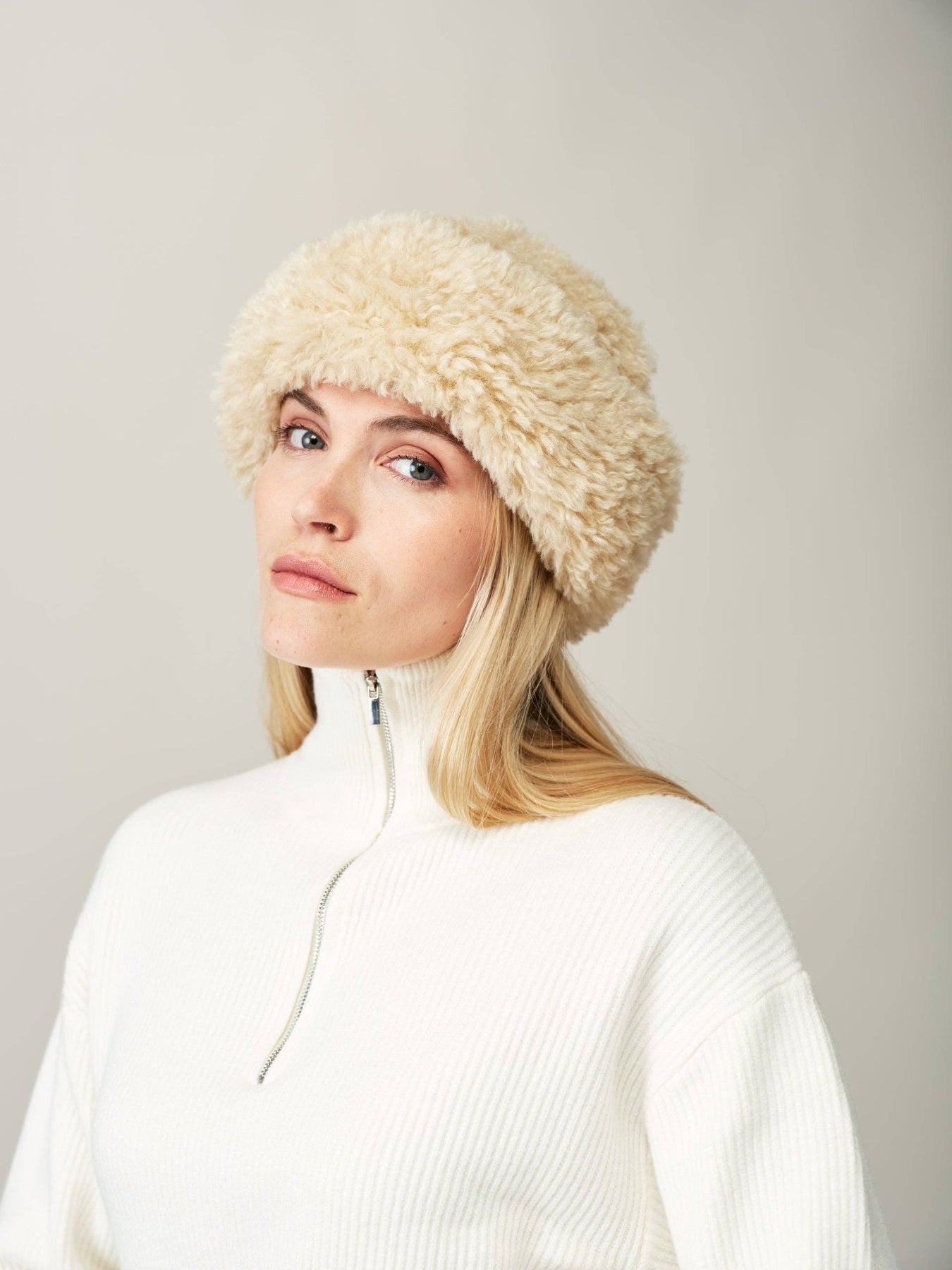 The Sherpa Hat highlights the texture and warmth of luxurious faux sheepskin. It has a deep brim which hugs the head and feels so warm. Now in lovely new colours for this season. Lined in super soft velboa. Sherpa Hats were originally made from real sheepskin and designed to be both functional and warm when worn in the mountains.