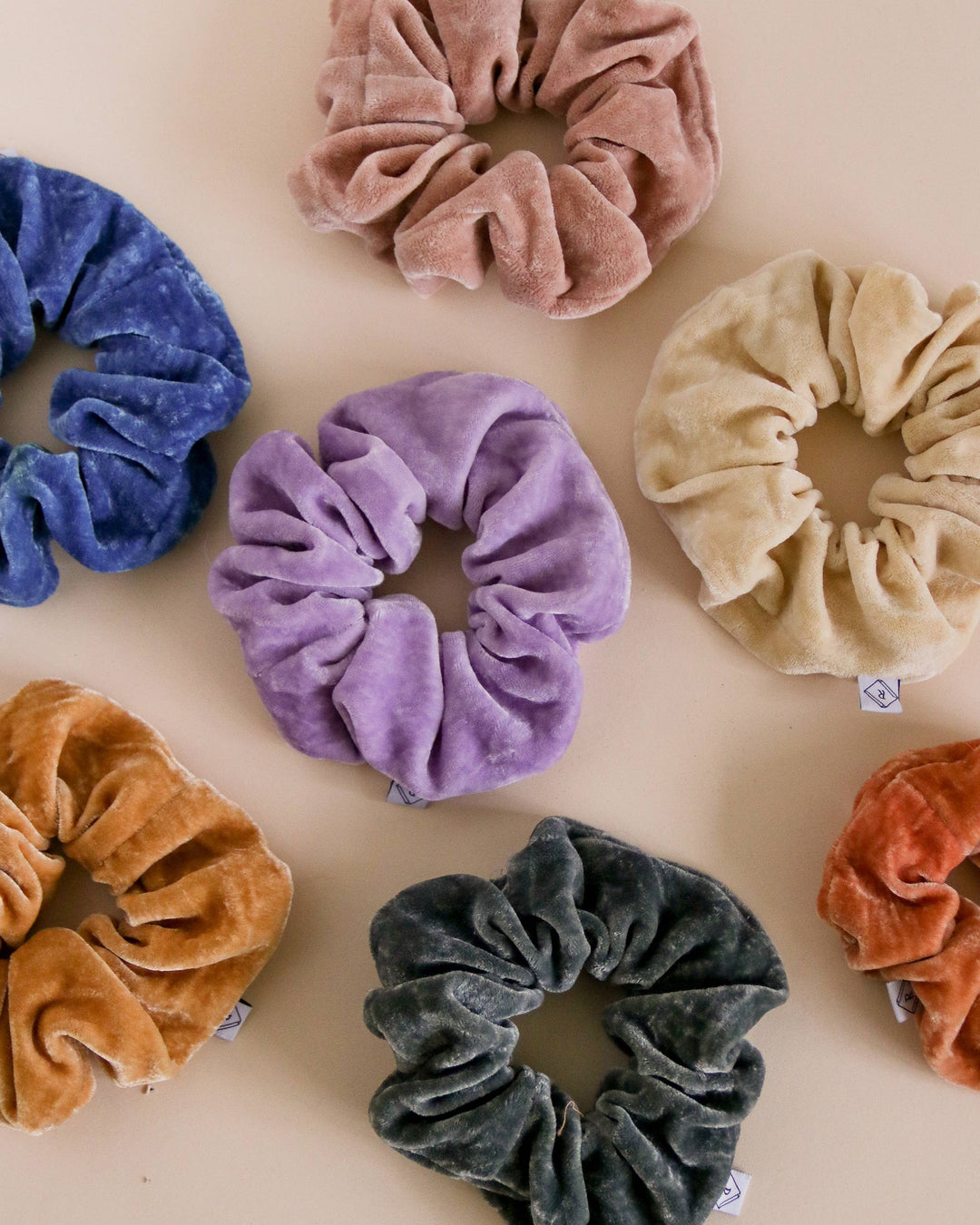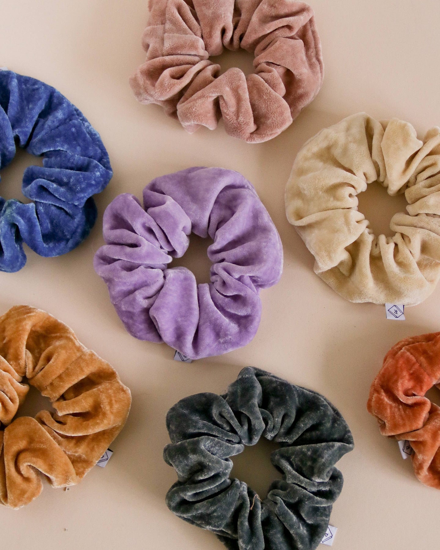 Scrunchies can be hand washed using a pH neutral soap in tepid water. Lie flat on a towel or drying rack to dry. If the silk wrinkles, gently steam or hand wash and lie flat or hang dry. We recommend Dr. Bronner's Castile Soap.
