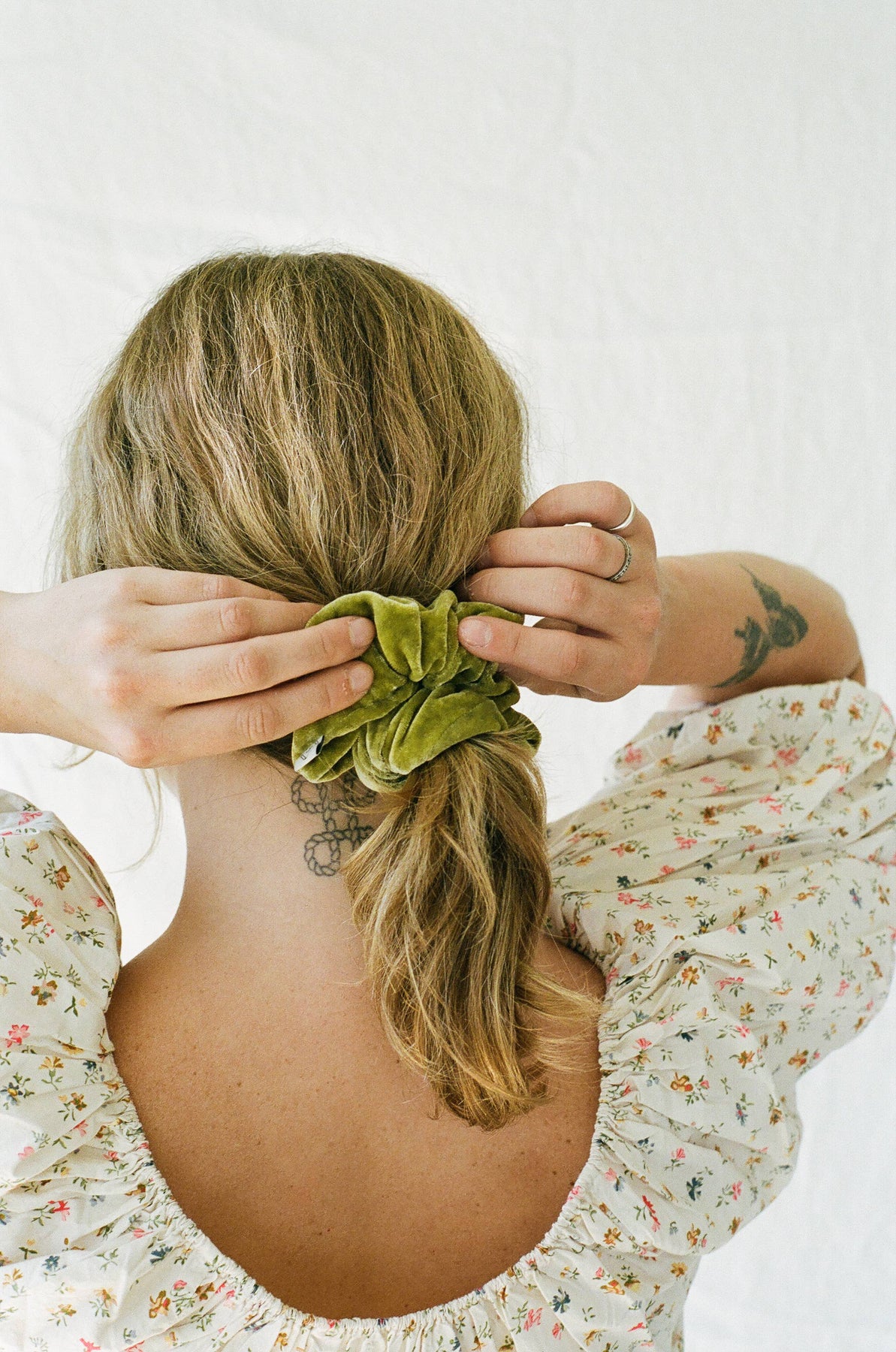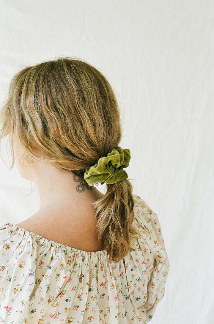 This scrunchie is made with silk velvet and dyed using marigold flowers and pomegranate rind to create a sage color. They are medium size and feature a cute little monogram label. Dyed and sewn in our Detroit studio.